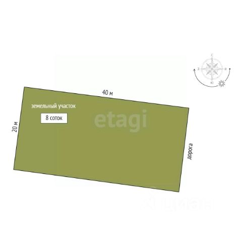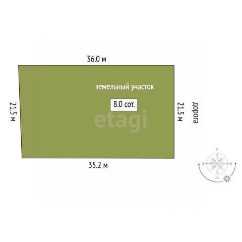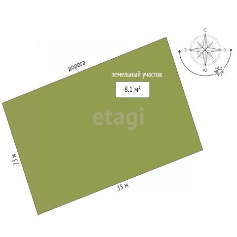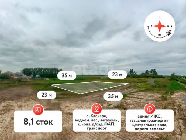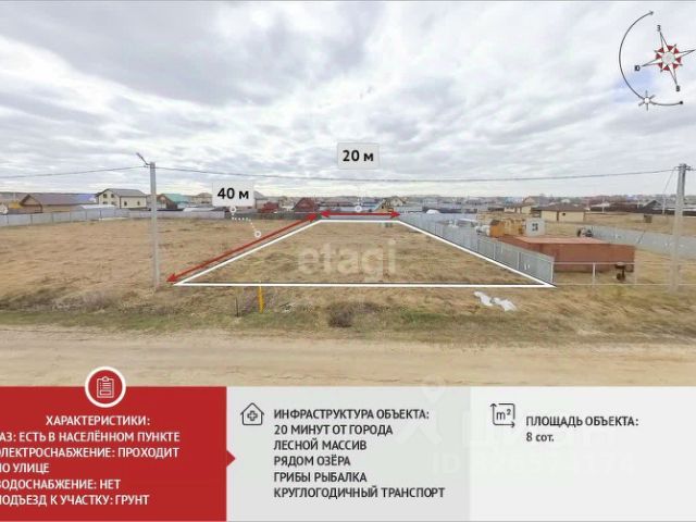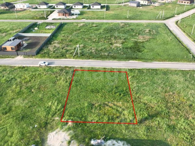 Участок правильной формы, не огорожен, высокий. Уровень грунтовых вод составляет 6-8 метров - высокое расположение поселка предусматривает возможность строительства подвальных, цокольных этажей, погребов. Вдоль улицы проходит газовая магистраль, что обеспечивает возможность подключения к газоснабжению. Электричество доступно благодаря расположенному рядом со столбом. На территории участка отсутствуют дополнительные постройки.