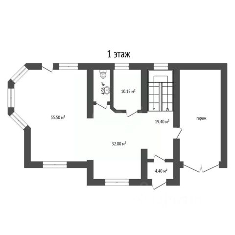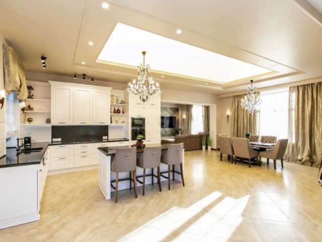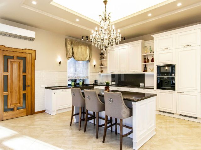 На первом этаже расположены: кухня 31.7 кв.м., гостиная 31.7 кв.м, холл 50.1 кв.м., совмещенный санузел 11.3 кв.м. на полу плитка, водяной теплый пол от газового котла, потолки натяжные комбинированные с гипсокартоном. На кухне установлен кухонный гарнитур со встраиваемой техникой. В обеденной зоне дорогостоящая итальянская мебель.