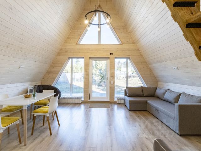 - Оснащена сплит-системой до 35 кв.м., двумя диванами, холодильником, телевизором (55 дюймов), блютуз-колонкой (100 Вт), столом на 10 персон и 10 стульями.