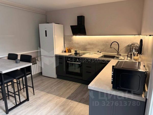 Мебель и техника — кухонный гарнитур со встроенным духовым шкафом, варочной панелью, вытяжкой, холодильник. В гостиной — огромный диван (около 3м), телевизор с большой диагональю, робот пылесос. Санузел — ванная на первом, уборная на каждом этаже. Спальня — двухспальная кровать, макияжный столик и шкаф для вещей, тумбочка и шкаф.