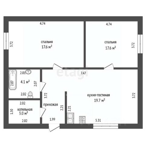 В доме очень удобная и многофункциональная планировка: большая кухня-гостиная для отдыха всей семьей или встречи с друзьями, две спальные комнаты правильной прямоугольной формы, санузел и котельная.