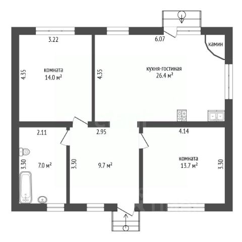 В доме 4 спальни, площадью от 17 до 25 кв.м., просторная гостиная 26 кв.м., кухня 22,5 кв.м., два санузла, площадью 6,5 и 10 кв.м.