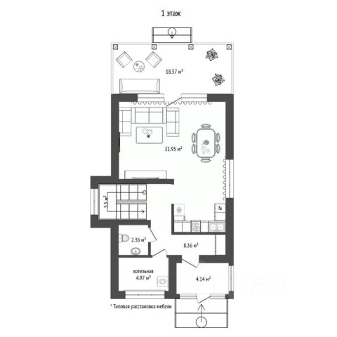 1 этаж: КУХНЯ-ГОСТИНАЯ - 19,5 КВ.М.; КАБИНЕТ - 7,9 КВ.М.; САНУЗЕЛ - 5,4 КВ.М.; ГАРДЕРОБ - 4,1 КВ.М.; КОТЕЛЬНАЯ - 2,2 КВ.М.; КОРИДОР - 5,0 КВ.М.; ТАМБУР - 2,4 КВ.М.; ТЕРРАСА, НАВЕС ДЛЯ МАШИНЫ.