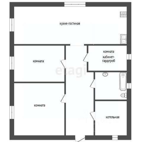 Планировка функциональная: включает прихожую с нишей под шкаф, просторную кухню-гостиную с выходом на террасу, оборудованную зону приготовления пищи, столовой зоны и гостиной, большой санузел и котельную с возможностью организации постирочной зоны; в доме три спальни, одна из которых имеет отдельный санузел и гардеробную комнату;