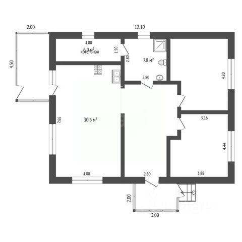 * Основной жилой дом - одноэтажный со вторым светом (высота потолков 3.2, в коньке 5.2), с огромными витражными окнами.