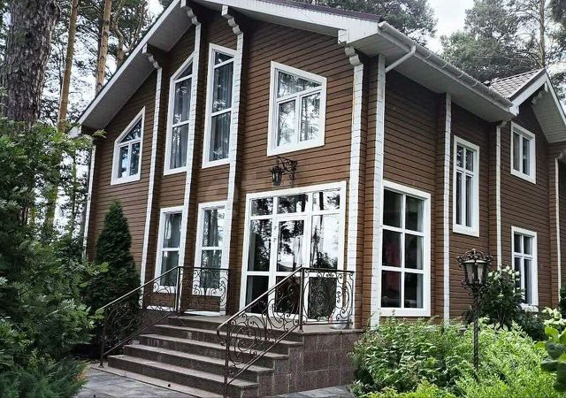 кв.м., три спальных комнаты площадью от 22 до 26 квадратных метров и совмещенный санузел. В цокольном этаже находятся прачечная, гардеробная, спортивный зал, кладовка и бытовая комната. Неповторимая прихожая с авторской росписью стен, текстильные декоративные панно, зеркальные шкафы-купе с пескоструйным рисунком, комбинированные потолки с встроенными многочисленными светильниками, модные современные текстильные обои на стенах из натурального, экологически чистого текстиля, фото обои, паркет из карельской березы, потолочный витраж "Тиффани", переливающийся всеми цветами радуги и наполняющий интерьер особым светом, мраморные подоконники, двери и лестницы, выполненные из натурального итальянского шпона, делают интерьер неповторимым и оригинальным. Теплый коридор соединяет коттедж с гостевым домом, изюминкой которого является многоуровневый 40-кубовый бассейн с потолочной подсветкой.