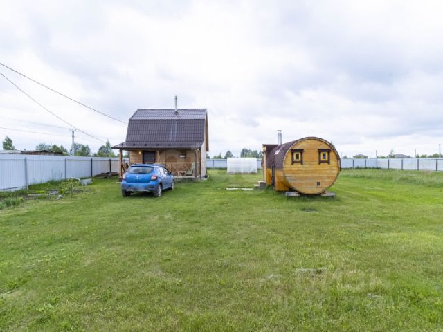 На участке расположена деревянная баня, беседка и выложена из кирпича зона барбекю (печь), поликарбонатная теплица, сарай, колодец и скважина.