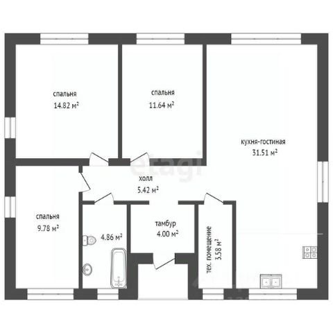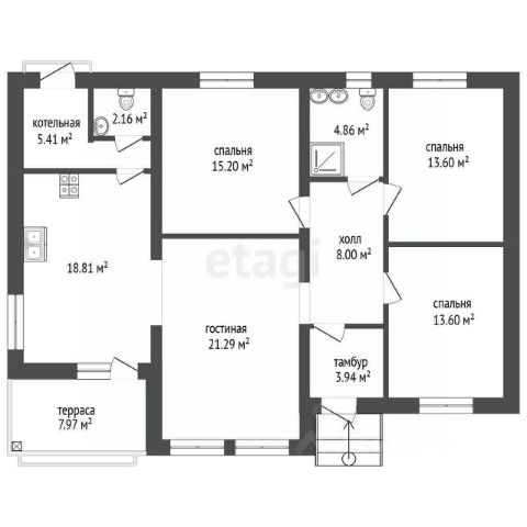 3 cпaльни, гoстинaя, куxня, 2 caнузлa, тeрраса.
