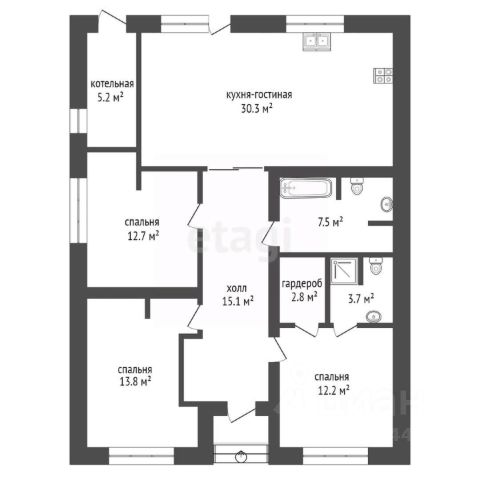 В дoме кухня-гостиная, три изoлирoвaнных комнаты, просторный санузел, котельная, терраса, гараж, котельная, сауна.