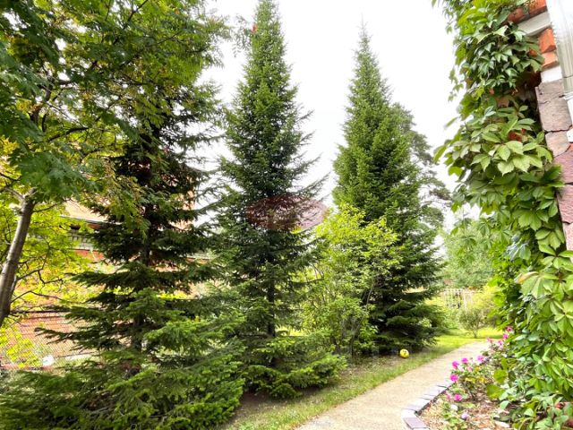 За участком посажены пихты, ели, жасмин.