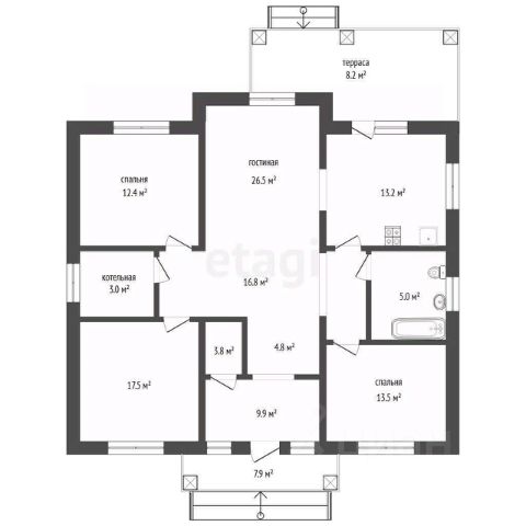 Планировка включает просторную кухню-гостиную площадью 22 кв. м, две изолированные спальни на 16 и 26 кв. м, большой санузел 8 кв. м и техническое помещение.