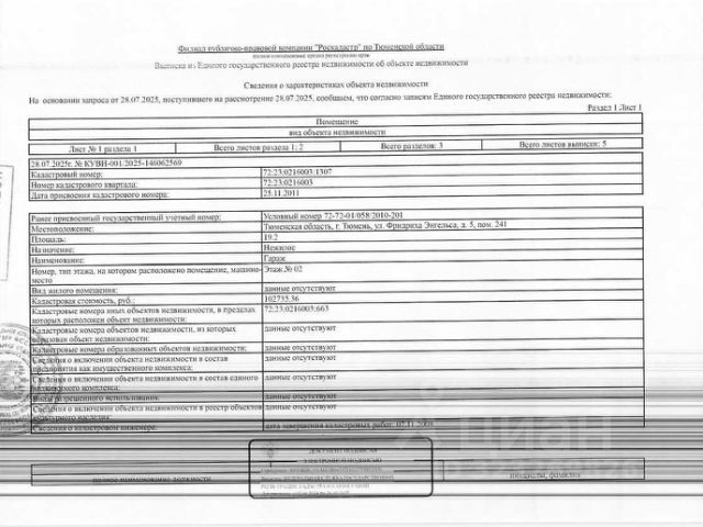 Данные получены с сайта ГИС Торги. Должник: Каширин В.А., собственник: Каширин В.А. Лот: Нежилое помещение (гараж), площадь 19,2 кв.м., кадастровый номер: 72:23:0216003:1307, г. Тюмень, ул. Фридриха Энгельса, д.5, пом.241, н/ц: 222200 р., з-к: 33330 р, код: 0001, рег. 72-010345-ГМУ;