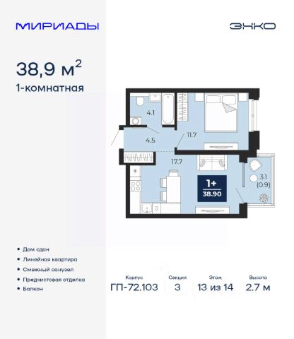 Продаётся квартира площадью 38.43 м2 в жилом комплексе "Дабл-Дабл". Квартира находится на 4 этаже, жилая площадь квартиры 13.03 м2, площадь просторной кухни — 11.41 м2. Среди особенностей планировки — изолированные комнаты с окнами на одну сторону, 1 совмещённый санузел. Срок сдачи — II кв. 2028 Жилой комплекс "Дабл-Дабл" — это: - проект комфорт-класса на Московском тракте - дома высотой 15 этажей - квартиры от 1-комнатных до 2-уровневых Окружение На границе жилого комплекса — живописный лес. Достаточно открыть окна, чтобы впустить в комнаты ароматы зелени, прохладу и чистый воздух. Благоустройство Юные жители оценят игровые площадки и воркаут-зоны. Любителям неспешных прогулок понравится 2-уровневый променад с панорамным видом и навесами. Лобби Помещения встречают дизайнерскими интерьерами с уютными лаунж-зонами, где удобно подождать курьера или просто сделать паузу перед возвращением домой. Колясочные Возвращайтесь налегке после прогулки с малышом — оставить коляску можно в специальном помещении на первом этаже. Кладовые Благодаря индивидуальным помещениям на техническом этаже сезонные и габаритные вещи будут на своём месте. 2-уровневые квартиры Просторная гостиная и кухня располагаются на первом этаже, спальня и кабинет — на втором. Почувствуйте, как жизнь выходит на новый уровень комфорта и приватности. Панорамное остекление Окна в пол наполняют комнаты светом и стирают границы между домом и природой. Встречайте рассветы или наслаждайтесь огнями вечернего города. Отделка Ровные стены, подготовленные полы и проведённые коммуникации — мы взяли на себя самые грязные и трудоёмкие этапы ремонта. Квартира станет чистым холстом, где легко создать интерьер в любом стиле. Продам квартиру 40 м2 (квадратных метров) в Тюменской области.
