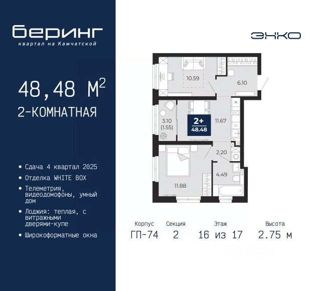 Продаётся квартира площадью 50.32 м2 в жилом комплексе "Смородина". Квартира находится на 2 этаже, жилая площадь квартиры 20.67 м2, площадь просторной кухни — 16.09 м2. Среди особенностей планировки — изолированные комнаты с окнами на одну сторону, 1 совмещённый санузел. Срок сдачи — IV кв. 2026 Жилой комплекс "Смородина" — это: - уютный малоэтажный комплекс в районе ММС - дома высотой 4 этажа - квартиры от студий до семейных вариантов с отапливаемыми лоджиями - экологичные материалы в благоустройстве территории Окружение В 5 минутах ходьбы от проекта — озеро Липовое с песчаным пляжем и лесопарковая зона. Инфраструктура В шаговой доступности есть все для комфортной жизни: школы, детские сады, магазины и аптеки. Рядом с проектом — остановка общественного транспорта. Благоустройство Прямо во дворе — собственные грядки для жителей, где можно выращивать зелень и цветы. Для детей оборудованы детские площадки из натуральных материалов. Лобби Вдохновленные современными тенденциями наши парадные разработаны с акцентом на эстетическую привлекательность и практичность. Использование натуральных материалов и ярких цветовых акцентов создает атмосферу уюта и стиля. Планировки Среди многообразия продуманных планировок есть и уютные студии, и просторные семейные варианты. Во всех квартирах предусмотрены отапливаемые лоджии, где можно устроить зону отдыха или рабочий кабинет. Квартира, примерная площадь 50 м2 в Тюмени.