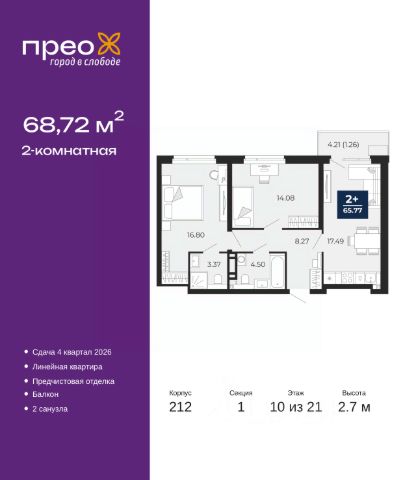 Просторная 2-комн. квартира с предчистовой отделкой в ЖК "Прео" на 10 этаже. Общая площадь: 68.72 кв.м., жилая: 30.88 кв.м., площадь просторной кухни-столовой: 17.49 кв.м. Комнаты изолированные, все окна выходят на одну сторону. В квартире один балкон, два совмещенных санузла. Высота потолков 2.7 м.