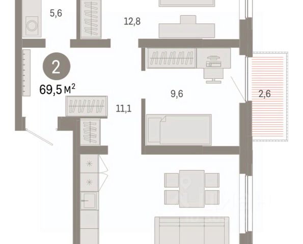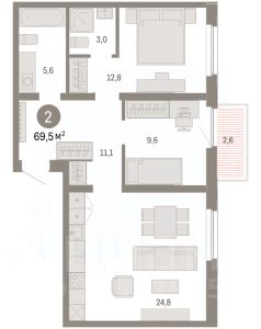 2-комн. квартира от застройщика с предчистовой отделкой в ЖК "Прео" на 9 этаже. Общая площадь: 68.72 кв.м., жилая: 30.88 кв.м., площадь просторной кухни-столовой: 17.49 кв.м. Комнаты изолированные, все окна выходят на одну сторону. В квартире один балкон, два совмещенных санузла. Высота потолков 2.7 м.