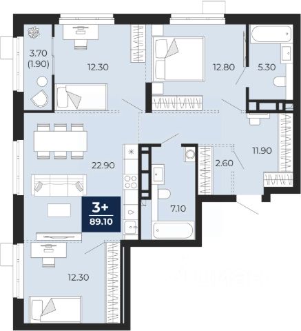 Общая площадь с учетом балкона и лоджии составляет 96,4 кв.м., из которых: