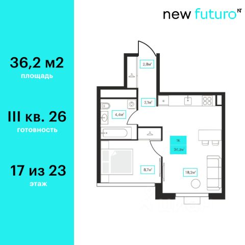Продаётся 1-комнатная квартира в строящемся доме (Дом 6к1), срок сдачи: III-кв. 2026, общей площадью 36.2 кв.м., на 17 этаже. Новый жилой комплекс "Futuro" от застройщика "newton" расположен в г. Тюмень на Ставропольской улице.