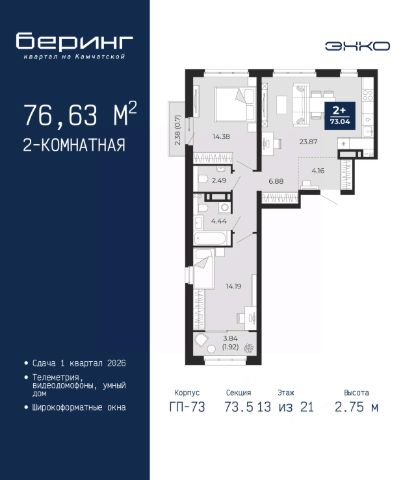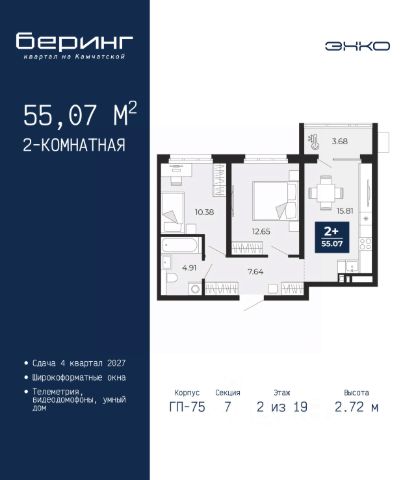 2-комн. квартира от застройщика в ЖК "Беринг" на 2 этаже. Общая площадь: 55.07 кв.м. Высота потолков 2.72 м. Дом монолитный, многоподъездный, переменной этажности, от 17 до 24 этажей. Квартира находится в 7-й секции высотой 19 этажей в корпусе ГП-75. На этаже 7 квартир. В подъезде 2 пассажирских и 1 грузовой лифт. Окончание строительства - 4 квартал 2027 года. Оформление сделки по договору долевого участия. Подобно знаменитому исследователю, мы чувствуем себя первооткрывателями этой локации. Хотим показать новую суть места, сформировать для вас жизненный опыт, которого ещё не было. Беринг — район зелёного цвета. Беринг — район, который откроется вам с другой стороны. Впечатлит новым уровнем комфорта и качеством жизни. Беринг — открытие на карте города. Первый квартал расположен в районе Тура, в границах улиц: Камчатская Западносибирская Энтузиастов. Вокруг уже есть всё для того, чтобы ежедневная рутина была лишь частью жизни и не доставляла дискомфорта. Школы и детские сады, магазины и аптеки, поликлиника, места для семейного отдыха, пеших и велопрогулок, и даже рыбалки. Масштабное озеленение дворов — визитная карточка ЭНКО и ваш оазис спокойствия, чтобы отвлечься от повседневности. Раскидистые деревья, кустарники, травы и цветы — осталось остановиться, вдохнуть и расслабиться, глядя на эту природную красоту. Стилистика подъездов продолжает концепцию Беринга, вдохновлённого Камчаткой: сдержанный, но при этом впечатляющий дизайн соседствует с удобством и функциональностью. #ZMdEDz