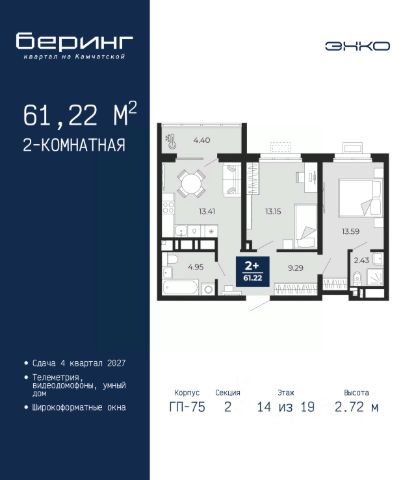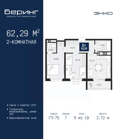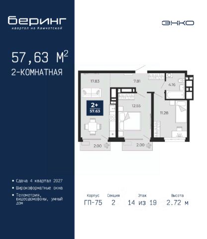Однокомнатная квартира в ЖК "Беринг" на 8 этаже. Общая площадь: 44.55 кв.м. Высота потолков 2.72 м. Дом монолитный, черырехподъездный, переменной этажности, от 19 до 24 этажей. Квартира находится в 1-й секции высотой 23 этажа в корпусе ГП-76. На этаже 7 квартир. В подъезде 2 пассажирских и 1 грузовой лифт. Окончание строительства - 4 квартал 2027 года. Оформление сделки по договору долевого участия. Подобно знаменитому исследователю, мы чувствуем себя первооткрывателями этой локации. Хотим показать новую суть места, сформировать для вас жизненный опыт, которого ещё не было. Беринг — район зелёного цвета. Беринг — район, который откроется вам с другой стороны. Впечатлит новым уровнем комфорта и качеством жизни. Беринг — открытие на карте города. Первый квартал расположен в районе Тура, в границах улиц: Камчатская Западносибирская Энтузиастов. Вокруг уже есть всё для того, чтобы ежедневная рутина была лишь частью жизни и не доставляла дискомфорта. Школы и детские сады, магазины и аптеки, поликлиника, места для семейного отдыха, пеших и велопрогулок, и даже рыбалки. Масштабное озеленение дворов — визитная карточка ЭНКО и ваш оазис спокойствия, чтобы отвлечься от повседневности. Раскидистые деревья, кустарники, травы и цветы — осталось остановиться, вдохнуть и расслабиться, глядя на эту природную красоту. Стилистика подъездов продолжает концепцию Беринга, вдохновлённого Камчаткой: сдержанный, но при этом впечатляющий дизайн соседствует с удобством и функциональностью. #Z70234