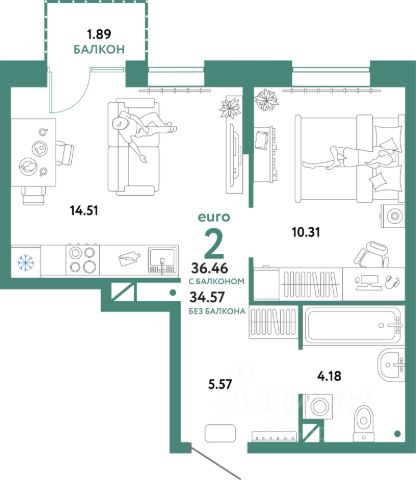 Две просторных спальни 14,57 и 12,79 кв.м. правильной квадратной формы.