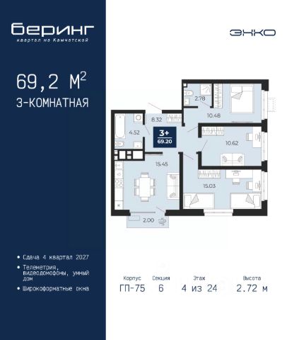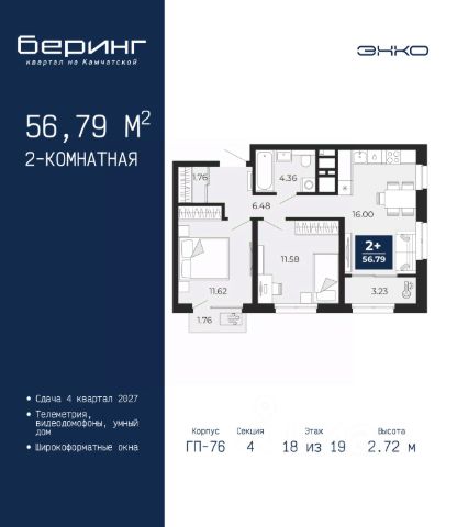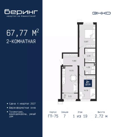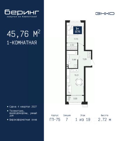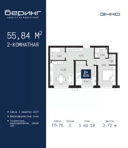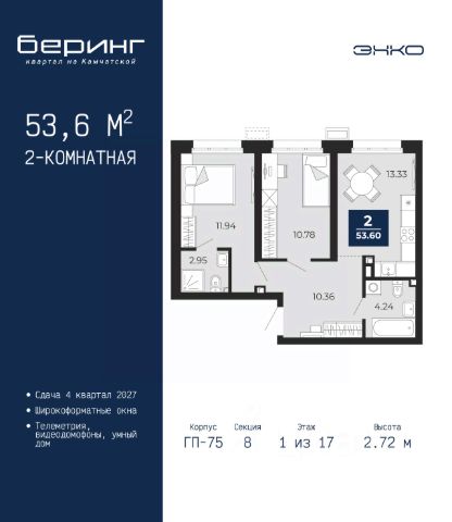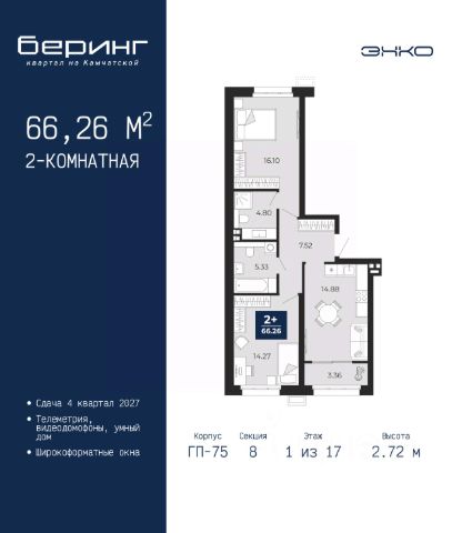 2-комн. квартира в ЖК "Беринг" на 5 этаже. Общая площадь: 62.29 кв.м. Высота потолков 2.72 м. Дом монолитный, многоподъездный, переменной этажности, от 17 до 24 этажей. Квартира находится в 7-й секции высотой 19 этажей в корпусе ГП-75. На этаже 7 квартир. В подъезде 2 пассажирских и 1 грузовой лифт. Окончание строительства - 4 квартал 2027 года. Оформление сделки по договору долевого участия. Подобно знаменитому исследователю, мы чувствуем себя первооткрывателями этой локации. Хотим показать новую суть места, сформировать для вас жизненный опыт, которого ещё не было. Беринг — район зелёного цвета. Беринг — район, который откроется вам с другой стороны. Впечатлит новым уровнем комфорта и качеством жизни. Беринг — открытие на карте города. Первый квартал расположен в районе Тура, в границах улиц: Камчатская Западносибирская Энтузиастов. Вокруг уже есть всё для того, чтобы ежедневная рутина была лишь частью жизни и не доставляла дискомфорта. Школы и детские сады, магазины и аптеки, поликлиника, места для семейного отдыха, пеших и велопрогулок, и даже рыбалки. Масштабное озеленение дворов — визитная карточка ЭНКО и ваш оазис спокойствия, чтобы отвлечься от повседневности. Раскидистые деревья, кустарники, травы и цветы — осталось остановиться, вдохнуть и расслабиться, глядя на эту природную красоту. Стилистика подъездов продолжает концепцию Беринга, вдохновлённого Камчаткой: сдержанный, но при этом впечатляющий дизайн соседствует с удобством и функциональностью. #zto27Z