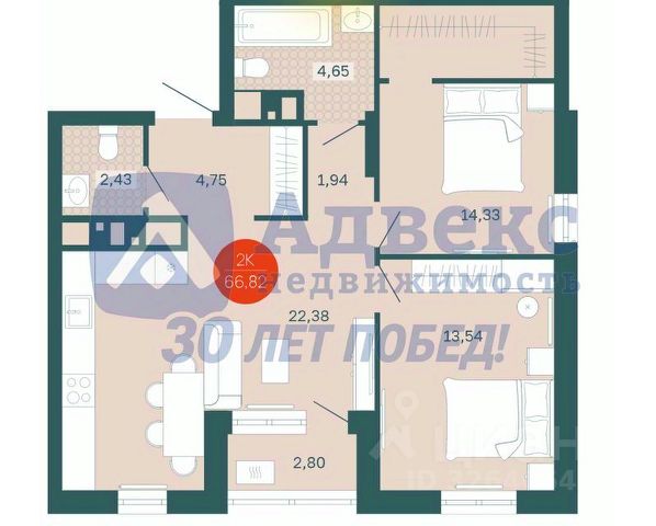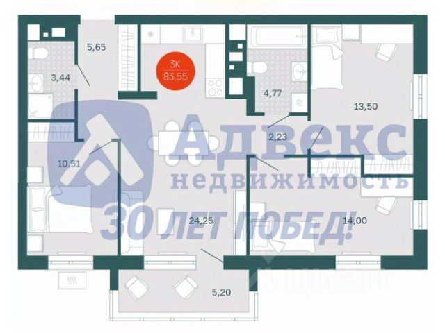 тремя изолированными комнатами правильной формы - 10,5 и 13,5 кв.м. и 14 кв.м., разнесенными по квартире, что обеспечит комфортное личное пространство для детей и родителей. В каждой комнате есть ниша под организацию мест для хранения вещей.