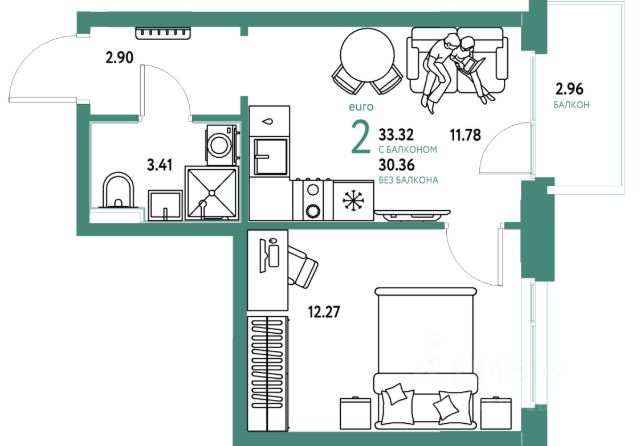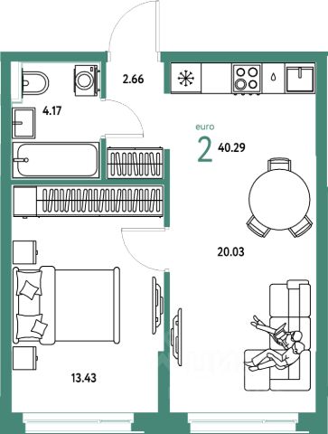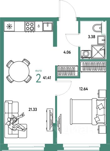 Просторная кухня правильной формы, гостиная 17, м² с окнами на две стороны и выходом на лоджию.