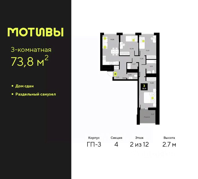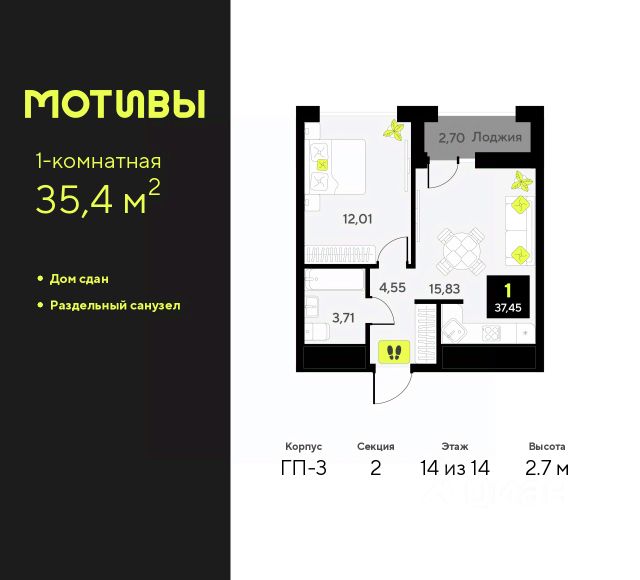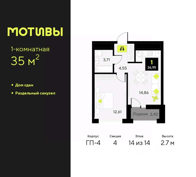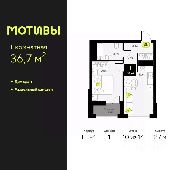 Однокомнатная квартира от застройщика в ЖК "Мотивы" на 11 этаже. Общая площадь: 36.6 кв.м. Высота потолков 2.7 м. Дом монолитный, черырехподъездный, переменной этажности, от 12 до 14 этажей. Квартира находится в 4-й секции высотой 12 этажей в корпусе ГП-3. На этаже 5 квартир. В подъезде 1 пассажирский и 1 грузовой лифт. В настоящее время строительство завершено, дом сдан в 4 квартале 2024 года. Оформление сделки по договору купли-продажи. Закрытая от автомобилей территория, безопасный двор и камеры видеонаблюдения - гаранты вашего спокойствия. Квартал будет располагать богатой инфраструктурой: на первых этажах разместятся магазины, пекарни, кофейни, пункты выдачи, аптеки, детские центры, цветочные салоны и многое другое, что сделает жизнь поистине комфортной. Рядом находится парк общей площадью почти 5000 м², в котором располагаются локации для игр и отдыха жителей, здесь можно совершить утреннюю пробежку или прогуляться после рабочего дня. В парке есть зона воркаута с тренажерами для взрослых, игровые комплексы с горками и канатный комплекс для детей разных возрастов, качели и лавочки для отдыха, площадки для командных видов спорта и для панна-футбола. В ЖК "Мотивы" всё продумано до мелочей: светлые холлы входных групп, оформленные в едином стиле, просторные колясочные, лапомойки для питомцев. На территории комплекса находятся 2 8-ми этажных паркинга и более 1000 м/м на открытой парковке. Жилой комплекс находится в одном из экологически благоприятных районов Тюмени, недалеко от Плехановского бора. При этом до центра города можно добраться за 15 минут, а до международного аэропорта Рощино за 13 минут. Окончание строительства: ГП 1, 2, 3, 4 сдача до конца 2024 года, ГП 6, 7, 8 сдача 2 квартал 2026 года. #2md4BT