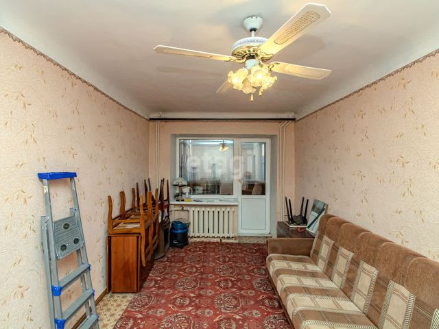 Просторная кухня правильной формы, гостиная 17, м² с окнами на две стороны и выходом на лоджию.