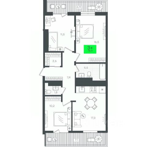 Квартира 2+ с двумя лоджиями и террасами в спальнях. Высота потолков - 3,35 м. В одной из спален также предусмотрен свой санузел. Спальни размещены по разные стороны, что помогает разграничить пространства для отдыха, а террасы с лоджиями помогут расширить возможности для приватного отдыха каждого члена семьи. Вместительные ванная комната, кухня-гостиная и прихожая позволяют свободно себя чувствовать и передвигаться дома. Гранд Квартал, 2-Д8.2, 1, 1, квартира 74