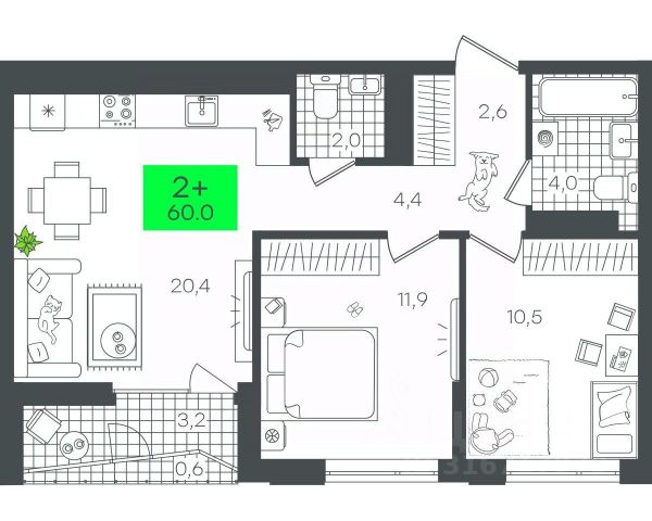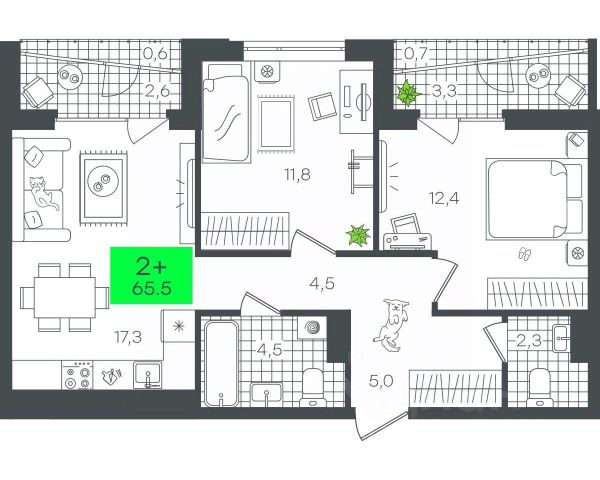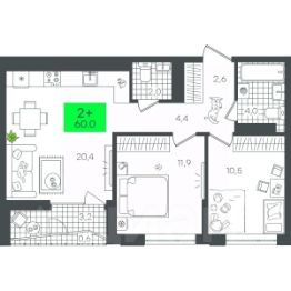Квартира 2+ с мастер-спальней и террасой на последнем этаже. Выходы на террасу есть из кухни-гостиной и обеих спален. В одной из спален спроектирована отдельная ванная комната. В просторной прихожей можно разместить несколько мест для хранения. В кухне-гостиной предусмотрена ниша под размещение кухонного гарнитура. Терраса расширит возможности для времяпрепровождения дома, здесь можно принимать солнечные ванны, заниматься спортом на свежем воздухе, жарить барбекю и устраивать пикники летом, украшать елку и получать больше витамина D зимой. Гранд Квартал, 2-Д8.2, 15, 2, квартира 156