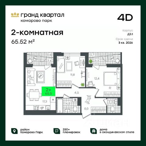 Продаётся 2-комнатная квартира в строящемся доме (1-Д3.1 (Глебова, 10)), срок сдачи: III-кв. 2026, общей площадью 65.52 кв.м., на 5 этаже. Компания 4D приступила к строительству нового жилого комплекса "Гранд квартал". Новый ЖК находится в зеленой зоне Калининского района, южнее микрорайона Тюменская слобода.
