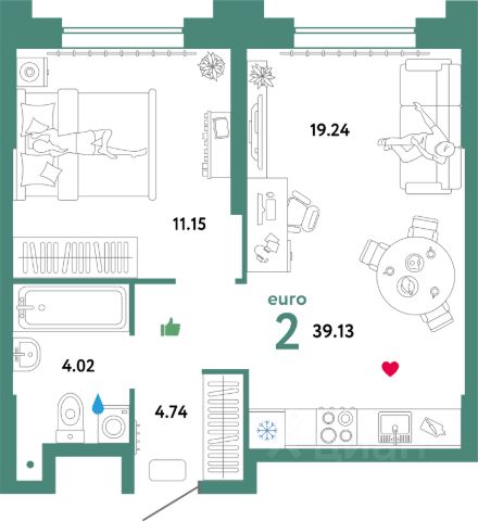 Функциональная планировка включает просторную кухню-гостиную с панорамными окнами, благодаря которым помещение наполняется естественным дневным светом, и две изолированные спальные комнаты.