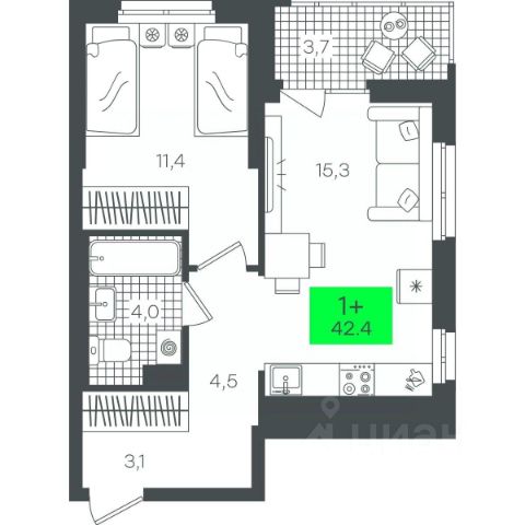 Продаётся 1-комнатная квартира в строящемся доме (В5.1 (Малкова, 19)), срок сдачи: III-кв. 2026, общей площадью 42.41 кв.м., на 13 этаже. Компания 4D приступила к строительству нового жилого комплекса "Гранд квартал". Новый ЖК находится в зеленой зоне Калининского района, южнее микрорайона Тюменская слобода.
