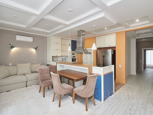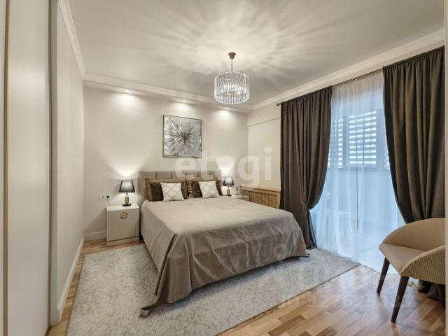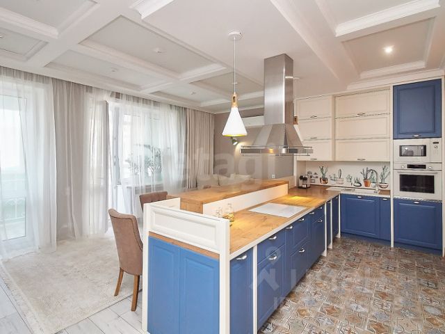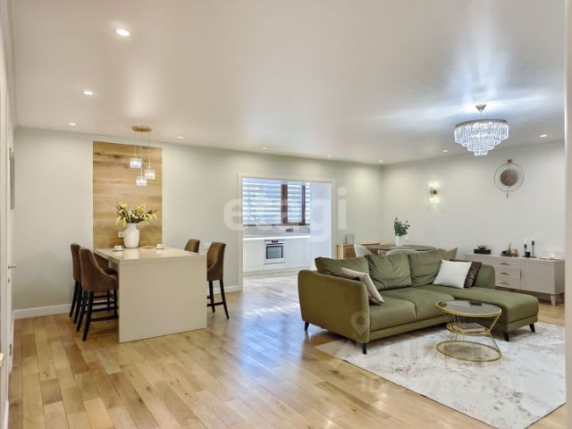 Квартира: Распашонка, окна выходят на обе стороны дома. Общая площадь: 134,8 кв.м. Состоит из кухни 21,7 кв.м. с выходом на лоджию: 6кв.м. она обшита деревом и застеклена. Спальня 1: 22,4 кв.м. Санузел гостевой, в коридоре, Спальня 2: используется как гардеробная 16,1 кв.м., Спальня 3: используется как детская комната 18.4 кв.м. Гостиная: 33 кв.м. Витражные окна. Санузел и ванная 5,1.