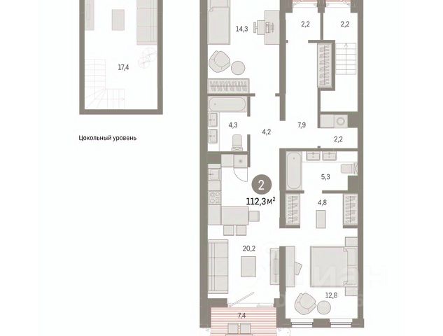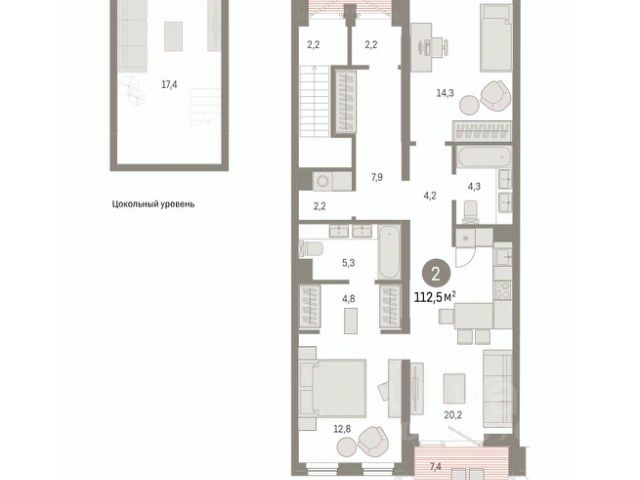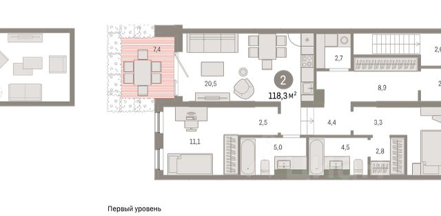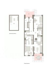 Продается двухкомнатная квартира с предчистовой отделкой в ЖК "Зарека" на 1 этаже. Общая площадь: 115.26 кв.м. Высота потолков 2.7 м. Дом монолитный, многоподъездный, переменной этажности, от 5 до 9 этажей. Квартира находится в 5-й секции высотой 8 этажей в корпусе 1. На этаже 7 квартир. В подъезде 1 грузовой лифт. Начало строительства - 3 квартал 2023 года. Окончание строительства - 3 квартал 2026 года. Оформление сделки по договору долевого участия. Двухуровневая квартира с кухней-гостиной и двумя спальнями в жилом районе "Зарека". Особенности планировки: вид во двор, двухуровневая, мастер-спальня, отдельный вход, панорамное остекление, предчистовая отделка, разнесённые спальни, терраса, терраса на крыше. квартиры в нашей базе: Панама01-01-5-5.1.1. Проект На планировочную структуру "Зареки" повлияла близость к автомобильному мосту Челюскинцев. Мы расположили жилые здания так, чтобы они постепенно удалялись от проезжей части. Приём напоминает лесенку: чем сильнее мост возвышается над участком застройки, тем дальше по отношению к нему стоят дома. Этот ступенчатый сдвиг позволил нам сформировать буфер между кварталами и оживлённой магистралью. Мы намерены высадить здесь высокие деревья и создать дополнительную защиту от дорожных шума и пыли. В границах нашего участка мы намерены разместить школу и два встроенных детских сада на 135 и 150 мест. Общественные пространства С севера на юг территорию будет пронизывать пешеходный бульвар. Мы мыслим это общественное пространство как главный центр притяжения. На нём будут сосредоточены основные детские игровые и спортивные зоны, места для встреч и спокойного отдыха. Он также сыграет роль мостика, ведущего к другим нашим проектам — "Европейскому кварталу" и "Дому у озера". Одна из базовых идей мастер-плана касается береговой линии. Сегодня озеленение этой территории носит стихииныи характер, а прямому доступу к Туре препятствует дамба. Мы хотим благоустроить пространства у воды и открыть их для людей. Архитекторы спроектировали систему многоярусных троп и спусков к реке, смотровые площадки и места для активного отдыха и пикников. #Ztoe2g