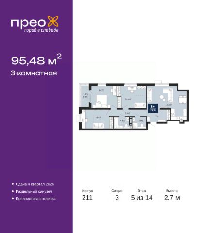 Продается 2-комн. квартира с предчистовой отделкой в ЖК "Прео" на 9 этаже. Общая площадь: 68.02 кв.м., жилая: 29.46 кв.м., площадь просторной кухни-столовой: 23.79 кв.м. Квартира угловая, очень светлая, естественная вентиляция при открытии окон. В квартире один совмещенный и один раздельный санузел. Высота потолков 2.7 м.