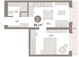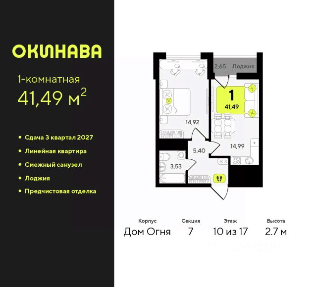 Однокомнатная квартира-студия от застройщика с предчистовой отделкой в ЖК "Окинава" на 10 этаже. Общая площадь: 24.67 кв.м., площадь гостиной 11.46 кв.м., из которых 5 кв.м. выделено под кухонную зону. Все окна выходят на одну сторону. В квартире одна лоджия, один совмещенный санузел. Высота потолков 2.7 м.