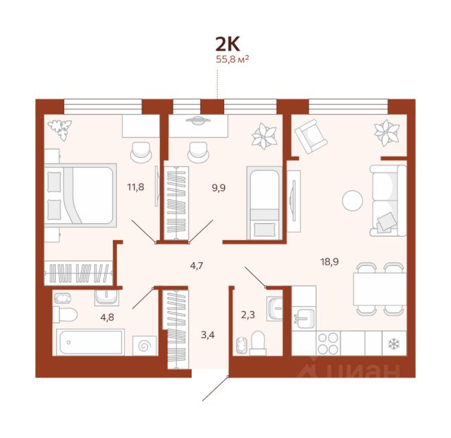 Продаётся 2-комнатная квартира в строящемся доме (ГП-1 (Новаторов, 28)), срок сдачи: IV-кв. 2025, общей площадью 55.8 кв.м., на 10 этаже. Новый жилой комплекс "Новатор" от застройщика ГК "СБК" расположен по адресу: г. Тюмень по ул. Новаторов.