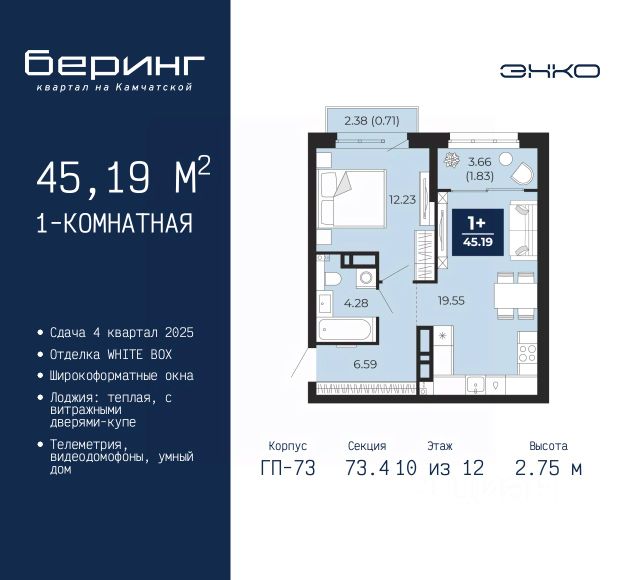 2-комн. квартира от застройщика в ЖК "Беринг" на 10 этаже. Квартира без отделки, после оформления собственности можно делать ремонт. Общая площадь: 59.97 кв.м., жилая: 28.53 кв.м., площадь просторной кухни-столовой: 14.38 кв.м. Комнаты изолированные, все окна выходят на одну сторону. В квартире одна лоджия, один совмещенный и один раздельный санузел. Высота потолков 2.75 м. Дом монолитный, многоподъездный, переменной этажности, от 9 до 21 этажей. Квартира находится в 4-й секции высотой 14 этажей в корпусе ГП-74. На этаже 7 квартир. В подъезде 1 пассажирский и 1 грузовой лифт. Окончание строительства - 4 квартал 2025 года. Оформление сделки по договору долевого участия. Подобно знаменитому исследователю, мы чувствуем себя первооткрывателями этой локации. Хотим показать новую суть места, сформировать для вас жизненный опыт, которого ещё не было. Беринг — район зелёного цвета. Беринг — район, который откроется вам с другой стороны. Впечатлит новым уровнем комфорта и качеством жизни. Беринг — открытие на карте города. Первый квартал расположен в районе Тура, в границах улиц: Камчатская Западносибирская Энтузиастов. Вокруг уже есть всё для того, чтобы ежедневная рутина была лишь частью жизни и не доставляла дискомфорта. Школы и детские сады, магазины и аптеки, поликлиника, места для семейного отдыха, пеших и велопрогулок, и даже рыбалки. Масштабное озеленение дворов — визитная карточка ЭНКО и ваш оазис спокойствия, чтобы отвлечься от повседневности. Раскидистые деревья, кустарники, травы и цветы — осталось остановиться, вдохнуть и расслабиться, глядя на эту природную красоту. Стилистика подъездов продолжает концепцию Беринга, вдохновлённого Камчаткой: сдержанный, но при этом впечатляющий дизайн соседствует с удобством и функциональностью. #zu5ME5