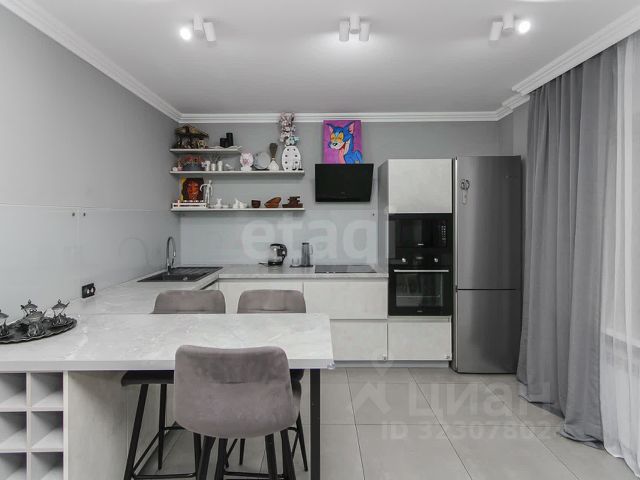Кухня с выходом на лоджию. Кухня оснащена: кухонным гарнитуром с подсветкой по всему периметру и большой рабочей поверхностью, раковиной с крылом, встроенной бытовой техникой (варочной панелью, вытяжкой, духовым шкафом, микроволновой печью, посудомоечной машиной) большим отдельно стоящим холодильником, и телевизором.
