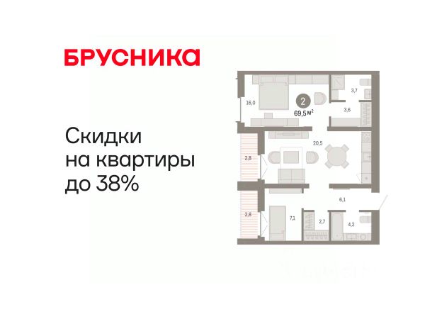 Квартира в счёт первоначального взноса по программе обмена. Звоните, мы вам все подробно расскажем! 2-комн. квартира с предчистовой отделкой в ЖК "Республики 205" на 10 этаже. Общая площадь: 69.47 кв.м., жилая: 23.1 кв.м., площадь просторной кухни-гостиной: 20.5 кв.м. Комнаты изолированные, все окна выходят на одну сторону. В квартире две лоджии, два совмещенных санузла. Высота потолков 2.7 м. Купить квартиру можно с помощью программ покупки от застройщика Брусника: - ипотека по эксклюзивной ставке с помощью в получении положительного кредитного решения через сервис ипотечный брокер; - квартиры в рассрочку без процентов от застройщика Брусника; - обмен квартиры на новую. Получить одобрение ипотеки или рассрочку, а также осуществить обмен квартир можно онлайн. Дом монолитный, многоподъездный, переменной этажности, от 7 до 16 этажей. Квартира находится в 3-й секции высотой 16 этажей в корпусе 2. На этаже 7 квартир. В подъезде 2 грузовых лифта. Начало строительства - 1 квартал 2024 года. Окончание строительства - 1 квартал 2026 года. Оформление сделки по договору долевого участия. Район Проект расположен в границах улиц Пермякова, Энергетиков, Воровского и Республики. До центра города — 10 минут на машине. Рядом — автомобильная развязка на пересечении улиц Пермякова и Республики. В шаговой доступности есть школы, детские сады, поликлиники, крупный торговый центр, автовокзал и несколько скверов. Проект "Республики 205" — это проект комплексного развития территории, уникальный по своему наполнению. Переосмысляя бывшую территорию завода медицинского оборудования, мы создадим новое место силы — микрорайон, насыщенный деловой, развлекательной, рекреационной, игровой, образовательной и медицинской инфраструктурой. До каждого полезного сервиса здесь можно будет дойти за 15 минут. Локальными центрами "Республики 205" будут общественные пространства — скверы, парки, бульвары и площади. В границах нашего участка мы намерены разместить школу, рассчитанную на 1550 учеников, два детских сада на 300 мест и встроенный детский сад на 100 мест. В одном из цехов бывшего завода расположится креативный кластер "Кузница". Он станет площадкой для нескольких институций — галереи, лектория, книжного магазина-библиотеки, кинобара и точек креативного pop-up-ритейла. Пешеходные бульвары внутри района соединят между собой улицу ресторанов, детские и спортивные площадки, событийную площадь и летний кинотеатр. Идентификатор квартиры по базе застройщика: РСП-02-3-3. #ZSMEWz
