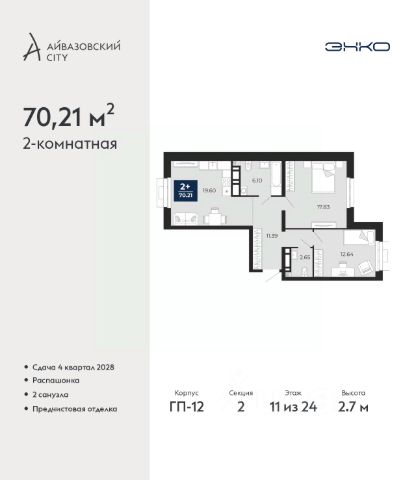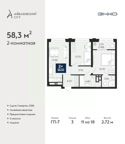 2-комн. квартира от застройщика с предчистовой отделкой в ЖК "Айвазовский City" на 11 этаже. Общая площадь: 58.3 кв.м., жилая: 22.9 кв.м., площадь просторной кухни-столовой: 17.3 кв.м. Комнаты изолированные, все окна выходят на одну сторону. В квартире одна лоджия, два совмещенных санузла. Высота потолков 2.72 м.