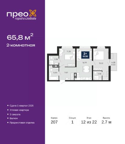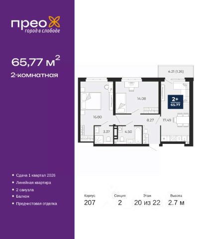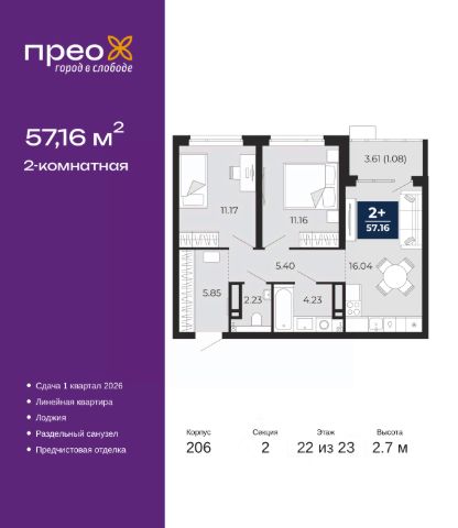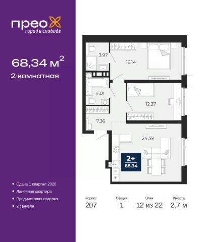 2-комн. квартира с предчистовой отделкой в ЖК "Прео" на 12 этаже. Общая площадь: 59.83 кв.м., жилая: 25.4 кв.м., площадь просторной кухни-столовой: 20.7 кв.м. Квартира угловая, очень светлая, естественная вентиляция при открытии окон. В квартире одна лоджия, один совмещенный санузел. Высота потолков 2.7 м.