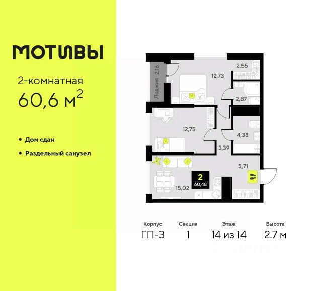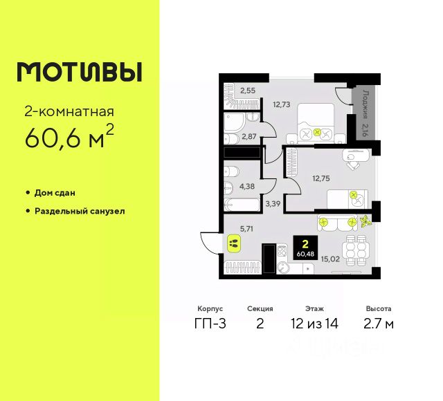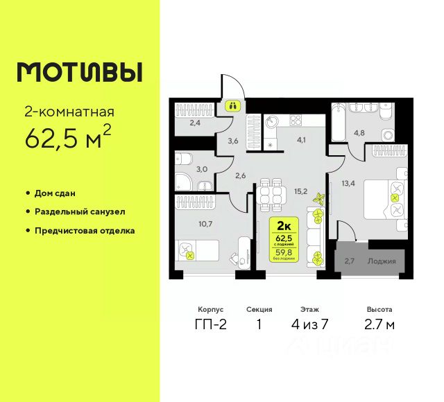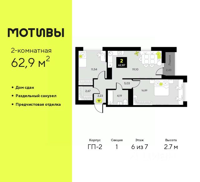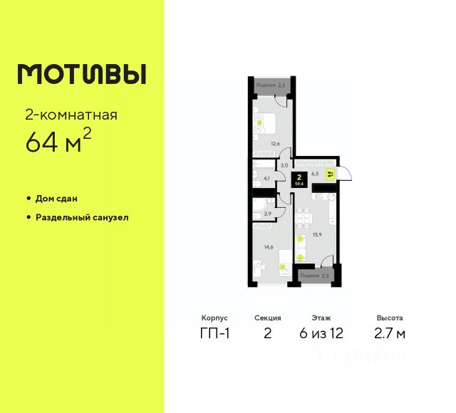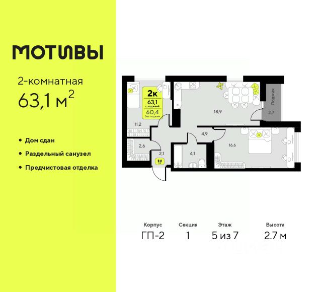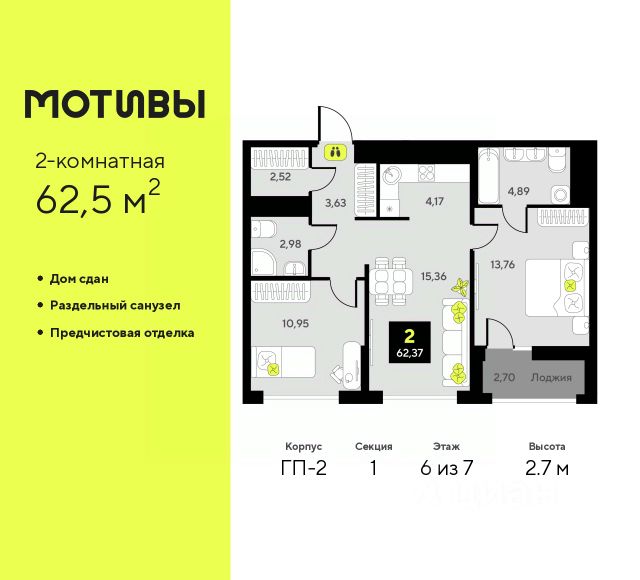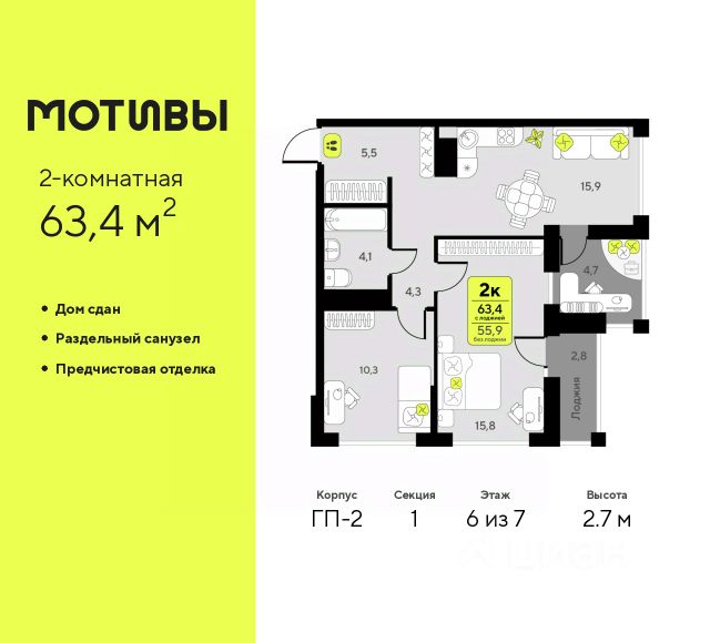 Просторная двухкомнатная квартира с предчистовой отделкой в ЖК "Мотивы" на 6 этаже. Общая площадь: 63.4 кв.м. Высота потолков 2.7 м.
