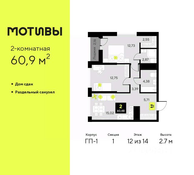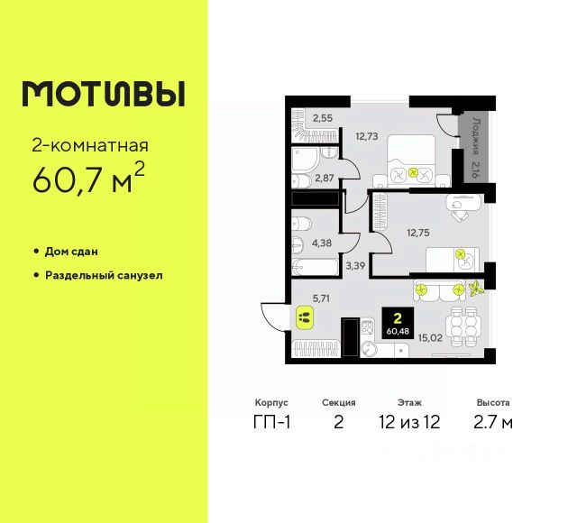 Квартира находится в корпусе ГП-2. Дом монолитный, одноподъездный, высотой 7 этажей. На этаже 5 квартир. В подъезде 1 пассажирский и 1 грузовой лифт. На сегодняшний день строительство окончено, дом сдан в 4 квартале 2024 года. Оформление сделки по договору купли-продажи.