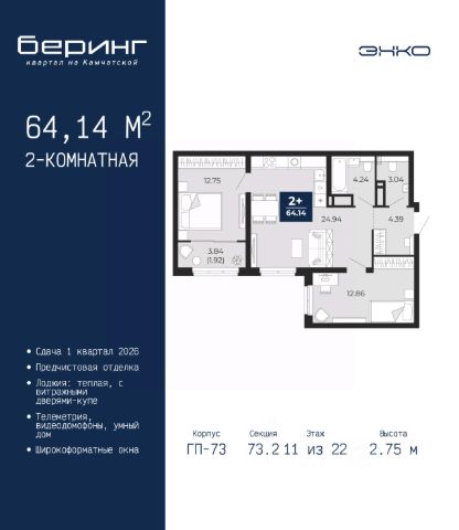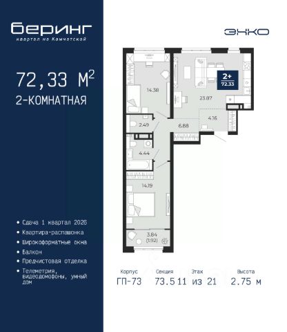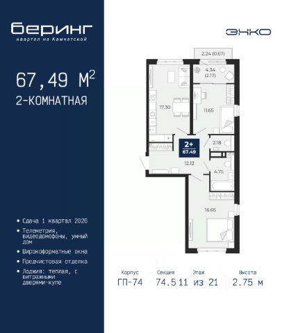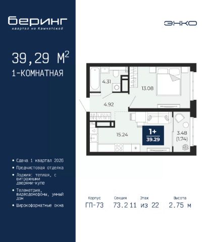Продается 1-комн. квартира от застройщика с предчистовой отделкой в ЖК "Беринг" на 11 этаже. Общая площадь: 37.32 кв.м., жилая: 11.42 кв.м., площадь просторной кухни-столовой: 15.49 кв.м. Все окна выходят на одну сторону. В квартире одна лоджия, один совмещенный санузел. Высота потолков 2.75 м. Дом монолитный, многоподъездный, переменной этажности, от 9 до 21 этажей. Квартира находится во 2-й секции высотой 17 этажей в корпусе ГП-74. На этаже 7 квартир. В подъезде 1 пассажирский и 1 грузовой лифт. Окончание строительства - 1 квартал 2026 года. Оформление сделки по договору долевого участия. Подобно знаменитому исследователю, мы чувствуем себя первооткрывателями этой локации. Хотим показать новую суть места, сформировать для вас жизненный опыт, которого ещё не было. Беринг — район зелёного цвета. Беринг — район, который откроется вам с другой стороны. Впечатлит новым уровнем комфорта и качеством жизни. Беринг — открытие на карте города. Первый квартал расположен в районе Тура, в границах улиц: Камчатская Западносибирская Энтузиастов. Вокруг уже есть всё для того, чтобы ежедневная рутина была лишь частью жизни и не доставляла дискомфорта. Школы и детские сады, магазины и аптеки, поликлиника, места для семейного отдыха, пеших и велопрогулок, и даже рыбалки. Масштабное озеленение дворов — визитная карточка ЭНКО и ваш оазис спокойствия, чтобы отвлечься от повседневности. Раскидистые деревья, кустарники, травы и цветы — осталось остановиться, вдохнуть и расслабиться, глядя на эту природную красоту. Стилистика подъездов продолжает концепцию Беринга, вдохновлённого Камчаткой: сдержанный, но при этом впечатляющий дизайн соседствует с удобством и функциональностью. #z692mz