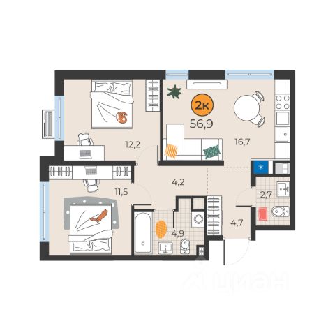 Жилые комнаты: 16,2 кв.м , 11,2кв.м и 13,7 кв.м - все комнаты изолированные, каждая из них оборудована гардеробной, что обеспечит вам максимальный комфорт и порядок.