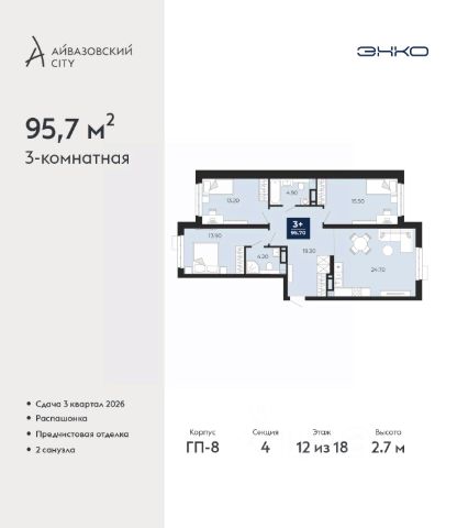 Продается трехкомнатная квартира с предчистовой отделкой в ЖК "Айвазовский" на 12 этаже. Общая площадь: 95.7 кв.м., жилая: 42.6 кв.м., площадь просторной кухни-столовой: 24.7 кв.м. Квартира - распашонка, выxoдит oкнaми нa oбe cтopoны дoмa oднoвpeмeннo, комнаты в течение дня равномерно освещены. В квартире два совмещенных санузла. Высота потолков 2.7 м.